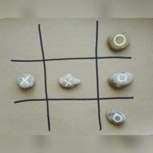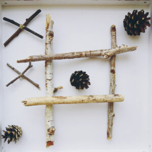 Plansza z papieru czy z patyków. Pozwól swojej wyobraźni zadziałać. Szyszki jako kółka, krzyżyk z związanych patyków. A może kółko i krzyżyk narysowane na kamieniach? Co wybierzesz dla siebie?